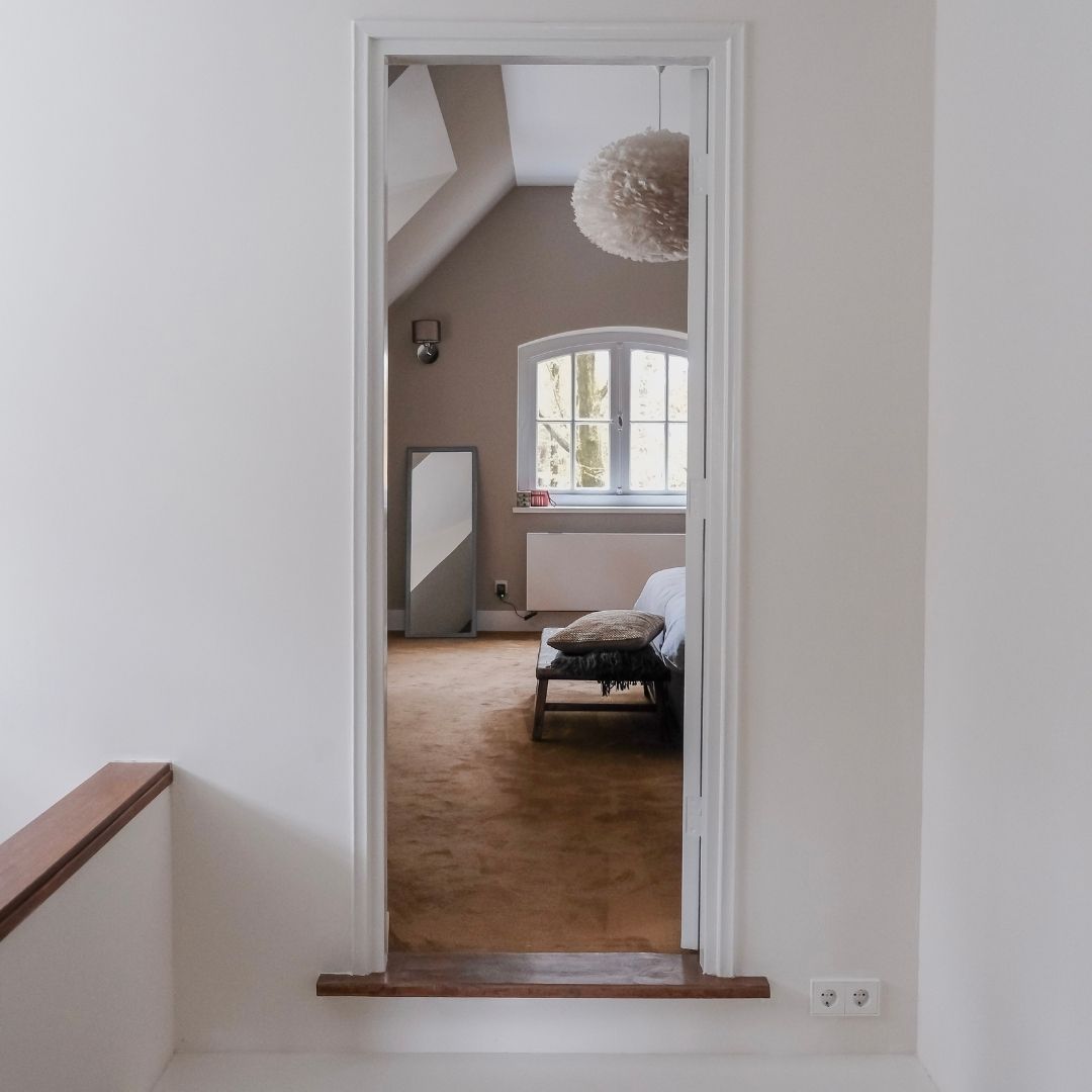 Slaapkamer op zolder met rondboogvenster, taupe muren, staande spiegel en sfeervolle veren hanglamp in Hilversum